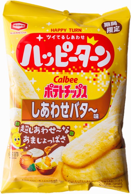 ポテチのフレーバーにはしあわせバタ~味が選ばれた。もともとあまじょっぱく、ハッピーターンとして違和感ないためだろう。意外性はないものの、ハッピーターンにバターのコクをあわせるとこうなるのか。抜群においしくて、定番化してほしいくらいだ。